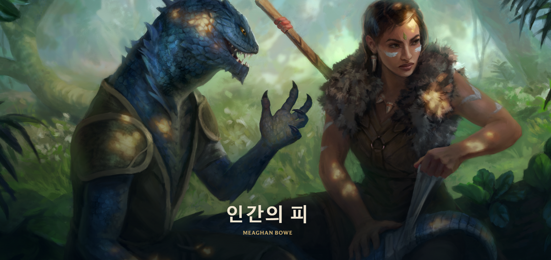 인간의 피 - MEAGHAN BOWE 시끄러운 총성. 기름과 연기, 화약의 악취. 이 소리와 냄새는 숲에서 날 만한 것이 아니었다. 니달리는 창을 들고 소리가 난 곳을 향해 달려갔다. 그녀는 매캐한 냄새를 따라 나무줄기와 빽빽한 덤불이 미로처럼 얽힌 곳을 지나갔다. 머지않아 니달리는 익숙한 장소에 도착했다. 개울 기슭에 있는 자그마한 공터였다. 생명이 넘쳐 나는 이 조용한 공간을 얕은 개울이 빠른 속도로 흘러 가로질렀다. 새끼 짐승도 어설픈 발짓으로 물고기를 잡을 수 있을 만큼 물고기가 풍부한 곳이었다. 잔잔한 대기에 무언가, 혹은 누군가가 고통스럽게 울부짖는 소리가 울려 퍼졌다. 니달리는 조심스레 창을 숨기고 개울가에 있는 두꺼운 나무 뒤에 자리를 잡았다. 개울 건너편에 파충류의 모습을 한 바스타야 남..